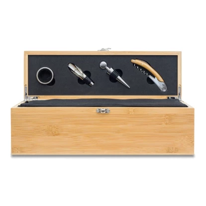 W zestawie znajdują się także: nóż kelnerski, pierścień na butelkę (okapnik), zatyczka, nalewak z zamknięciem. Bambus jest produktem naturalnym, mogą wystąpić niewielkie różnice w kolorze co może mieć wpływ na końcowy efekt znakowania.